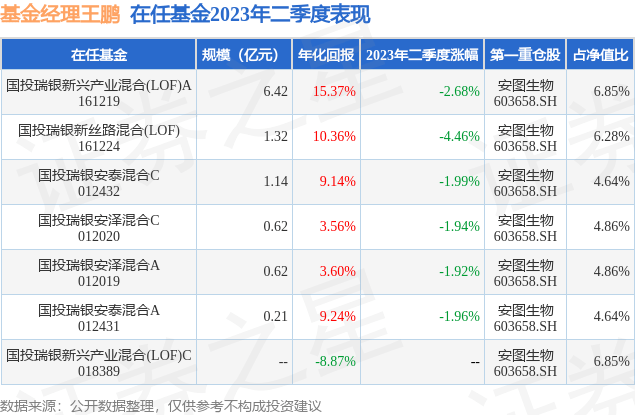 截止2023年二季度末,基金经理王鹏旗下共管理7只基金,本季度表现最佳的为国投瑞银安泽混合A(012019),季度净值跌1.92%。