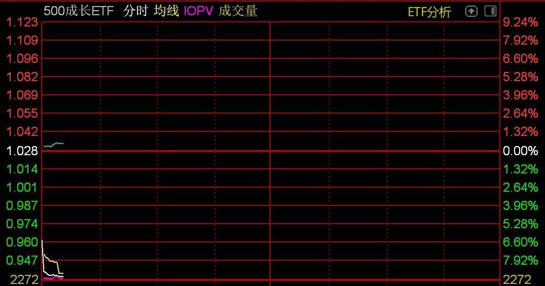 500成长ETF早盘跌逾9%,昨日尾盘该ETF异动拉升逾10%,截至昨日收盘溢价达10%,今日早盘下跌后,溢价已基本消除。