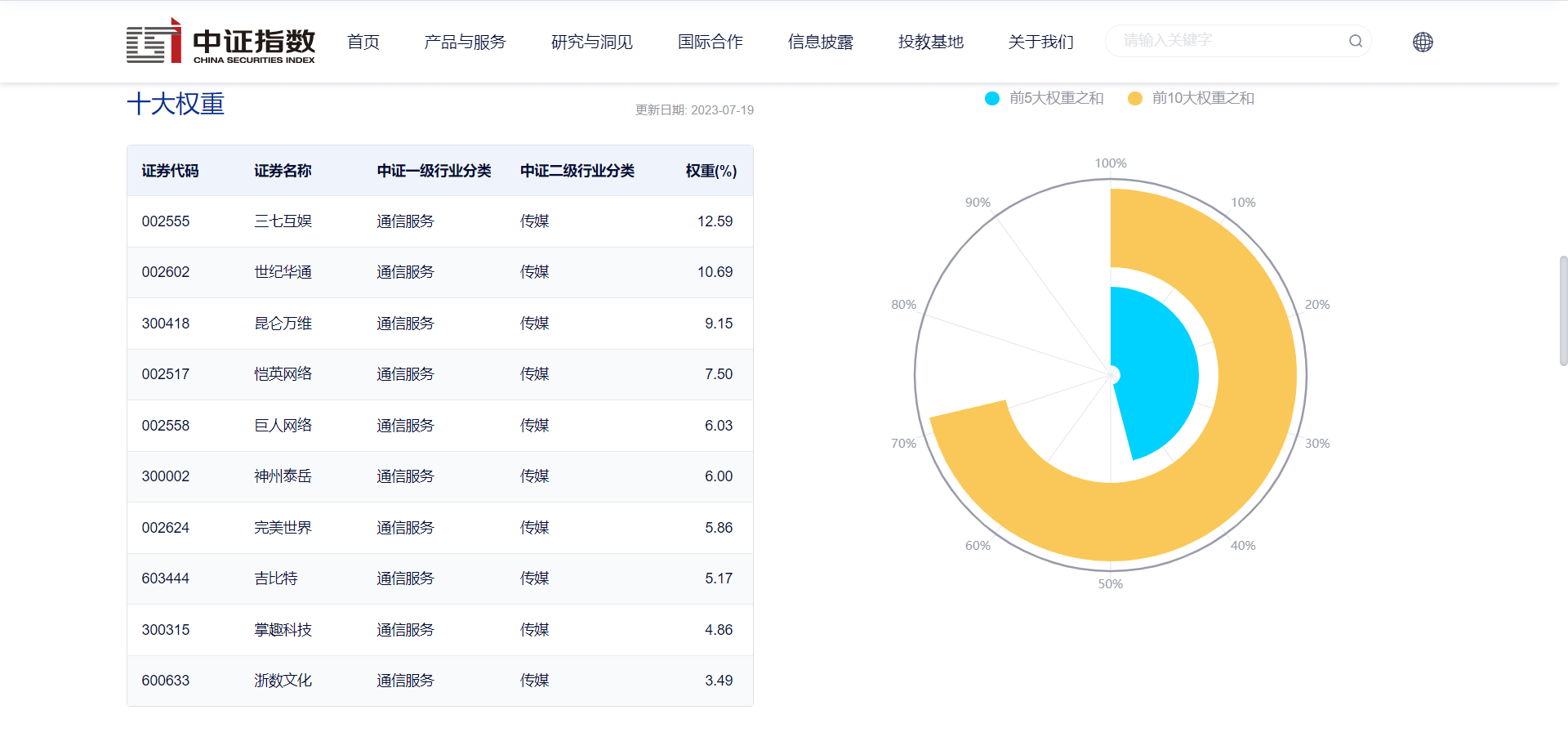 数据显示,截至2023年7月19日,该指数前十大权重股包括三七互娱、世纪华通、昆仑万维、恺英网络、巨人网络等,前十大之和为71.32%。(数据来源:中证指数公司,指数成份股不代表个股推荐)