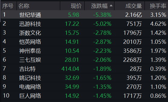 游戏ETF(516010)紧密跟踪中证动漫游戏指数。指数成份股中,世纪华通下跌5.38%,迅游科技下跌5.02%,浙数文化、恺英网络、神州泰岳等个股跟跌,跌幅均超2%。