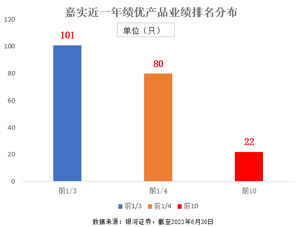 银河证券数据统计,截至2023年6月30日,嘉实基金旗下101只(子份额分别计算,下同)产品过去一年回报排名同类前1/3,80只居于同类产品前1/4,有22只高居同类TOP10。