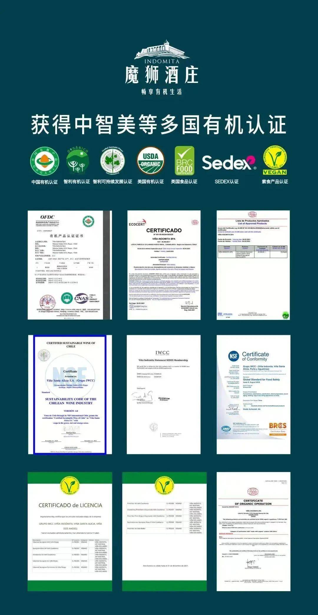 目前,魔狮酒庄已经获得包括中国有机认证、智利有机认证、美国农业部有机认证(USDA)、英国零售商协会食品认证(BRC)等在内的多项国际有机领域方面的权威认证。