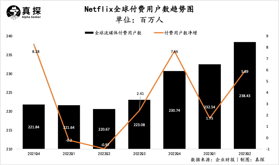 在一系列业绩数据里,新增用户数向来是奈飞最受关注的关键指标。2023年Q2,奈飞新增用户数589万,相较去年同期的-97万大幅回暖,而且还远高于市场预期的180万。