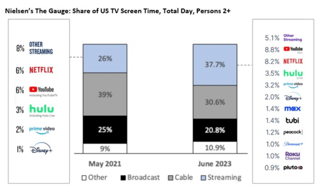 特别是今年,线下经济回暖,影院、主题乐园恢复了以往的人流量,高频洗脑的短视频又疯狂崛起,更多的娱乐方式选择也使得流媒体的生存空间变得狭窄。流媒体行业也越来越“内卷”,尼尔森数据显示,2021年流媒体行业玩家仅有奈飞、YouTube、hulu、Disney+等六家,而到了2023年入局玩家增加到12家,奈飞的霸主地位受到威胁——比内容库,迪士尼、康卡斯特、派拉蒙、华纳兄弟都有着丰富的IP优势和制作经验;比资金,苹果、亚马逊和YouTube都毫无逊色,而且苹果还有硬件优势、亚马逊有广告资源。