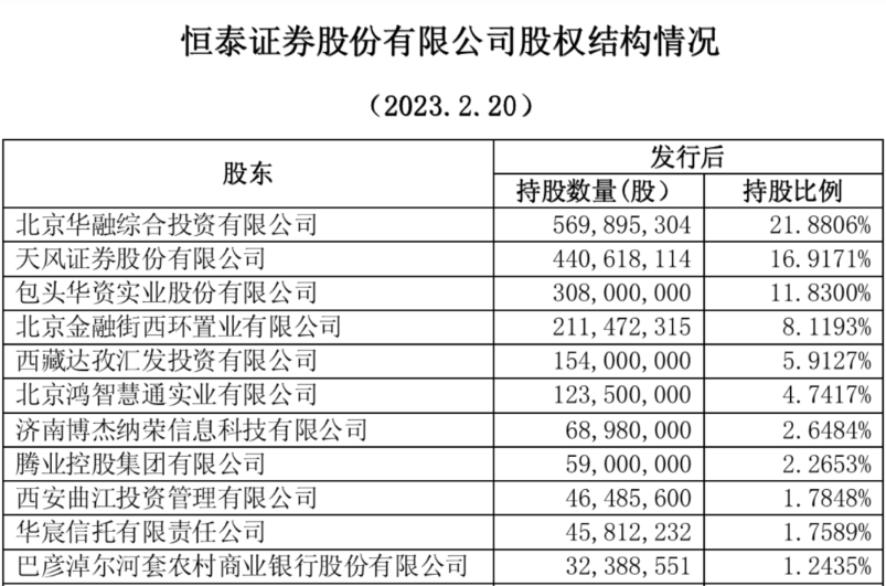 2022年9月30日,天风证券发布公告称,计划向北京华融综合投资有限公司转让持有的恒泰证券2.49亿股股份,价格约为每股7.22元,总计18亿元。北京华融是金融街集团的全资子公司,该转让完成后,金融街集团与其控股子公司合计持有恒泰证券股权比例29.99%。