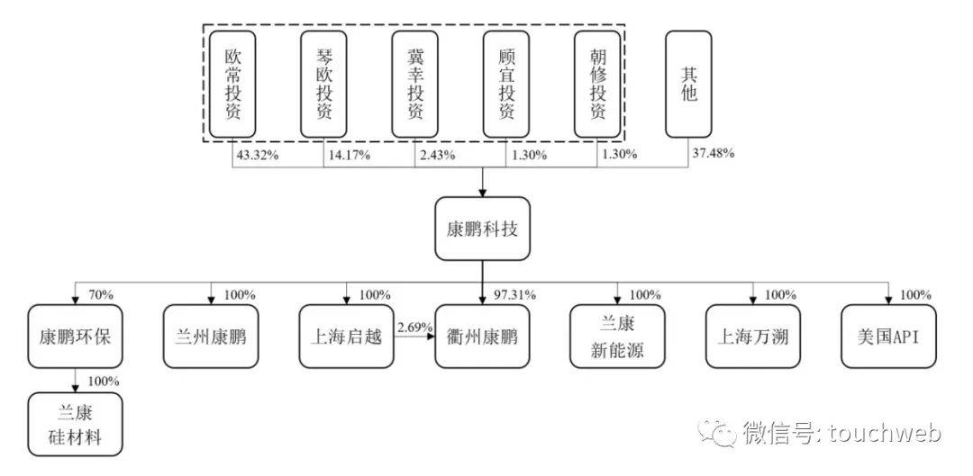 IPO前,康鹏科技的实际控制人为杨建华家族(杨建华、查月珍及杨重博),杨建华家族通过欧常投资、琴欧投资、冀幸投资、朝修投资和顾宜投资分别控制公司43.32%、14.17%、2.43%、1.3%和1.3%的股份,合计控制公司62.52%的股份。
