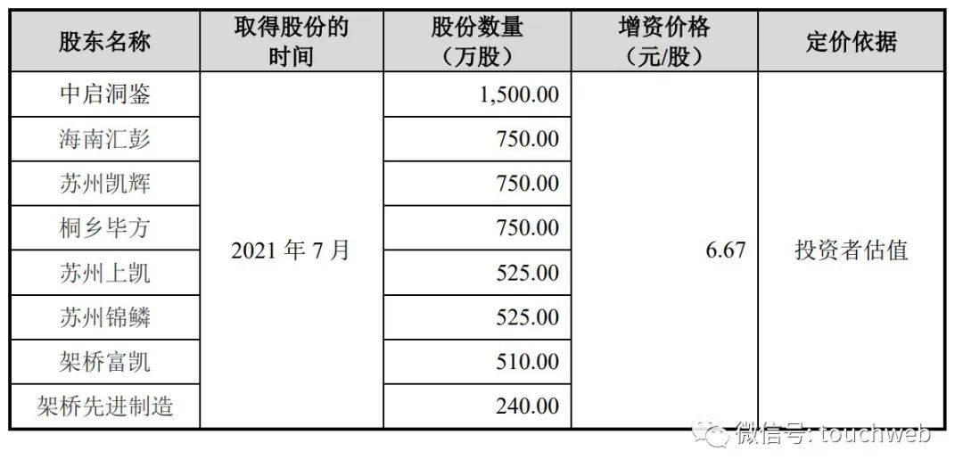 中启洞鉴、海南汇彭、苏州凯辉、桐乡毕方、苏州上凯、苏州锦鳞、架桥富凯、架桥先进制造均为公司申报IPO前一年入股,每股成本为6.67元,总投资金额为3.7亿元。