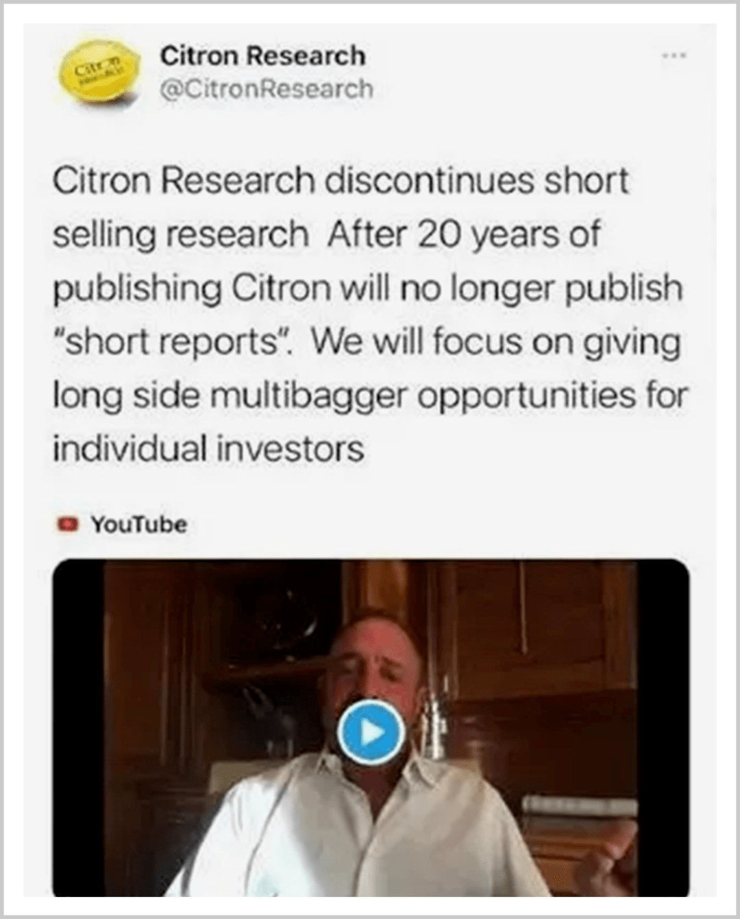 1月29日,香橼资本宣布“缴械投降”,创始人安德鲁·莱福特眼含热泪发表声明称:香橼以后再也不做空了。
