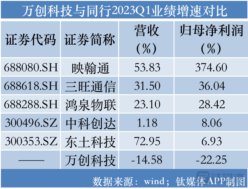 值得一提的是,万创科技一季度的业绩变动趋势与行业背离,就在万创科技一季度业绩下滑的同时,公司同行(688080.SH)、(688618.SH)等的营收和净利润均录得正增长。