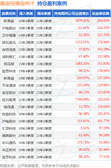 金梓才管理的财通成长优选混合基金在18年4季度买入新易盛,在持有2年又3个季度后在21年3季度卖出。持有期间的估算收益率为294.02%,持有期间新易盛在2018年到2021年的年报归属净利润增幅达1979.41%。