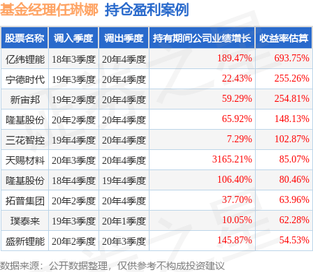 任琳娜管理的申万菱信新能源汽车混合基金在18年3季度买入亿纬锂能,在持有2年又1个季度后在20年4季度卖出。持有期间的估算收益率为693.75%,持有期间亿纬锂能在2018年到2020年的年报归属净利润增幅达189.47%。