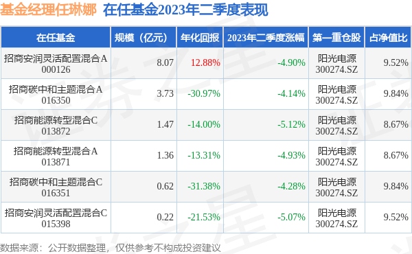 截止2023年二季度末,基金经理任琳娜旗下共管理6只基金,本季度表现最佳的为招商碳中和主题混合A(016350),季度净值跌4.14%。