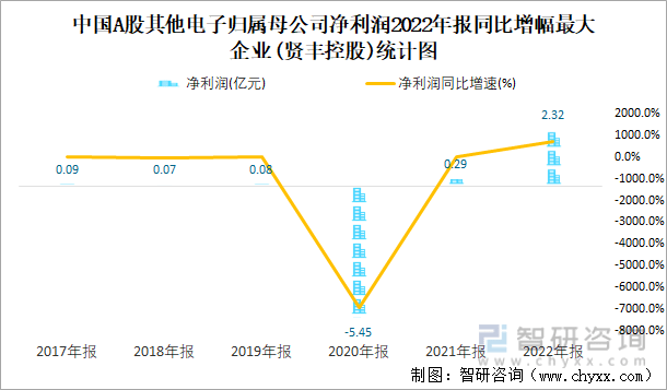 中国A股其他电子归属母公司净利润2022年报同比增幅最大企业(贤丰控股)统计图