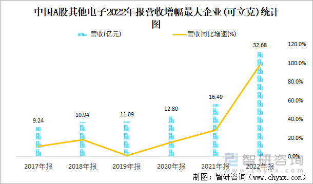 中国A股其他电子2022年报营收增幅最大企业(可立克)统计图