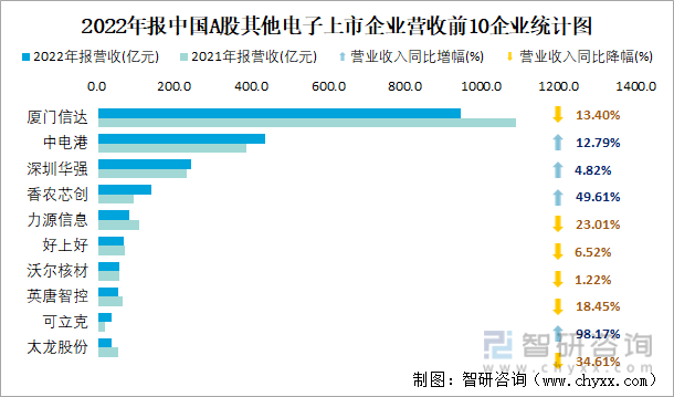 2022年报中国A股其他电子上市企业营收前10企业统计图