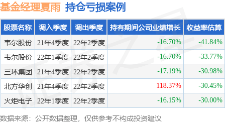 夏雨管理的工银聚安混合A基金在21年4季度买入韦尔股份,在持有2个季度后在22年2季度卖出。持有期间的估算收益率为-41.84%,持有期间韦尔股份在2021年到2022年的年报营业总收入降幅为16.7%。