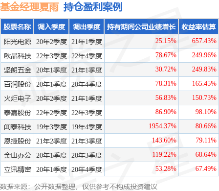夏雨管理的工银聚安混合A基金在22年2季度买入泰嘉股份,在持有1个季度后在22年3季度卖出。持有期间的估算收益率为98.1%,持有期间泰嘉股份在2021年到2022年的年报归属净利润增幅达86.9%。