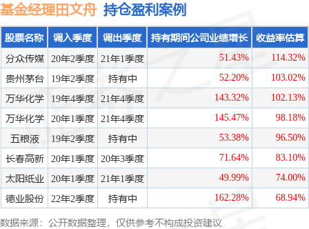田文舟管理的广发成长新动能混合A基金在20年1季度买入万华化学,在持有1年又3个季度后在21年4季度卖出。持有期间的估算收益率为98.18%,持有期间万华化学在2020年到2021年的年报归属净利润增幅达145.47%。