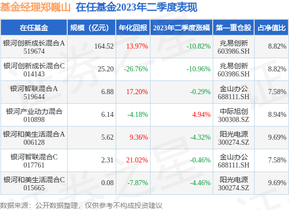 截止2023年二季度末,基金经理郑巍山旗下共管理7只基金,本季度表现最佳的为银河产业动力混合(010898),季度净值涨4.94%。