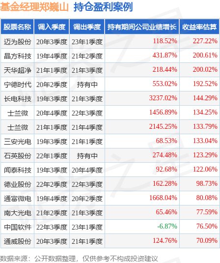 郑巍山管理的银河和美生活混合A基金在20年3季度买入迈为股份,在持有2年又2个季度后在23年1季度卖出。持有期间的估算收益率为227.22%,持有期间迈为股份在2020年到2022年的年报归属净利润增幅达118.52%。