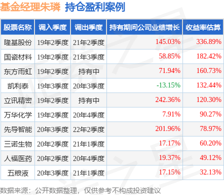 朱璘管理的睿远成长价值混合A基金在19年2季度买入隆基股份,在持有2年又0个季度后在21年2季度卖出。持有期间的估算收益率为336.89%,持有期间隆基股份在2019年到2021年的年报营业总收入增幅达145.03%。