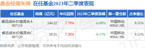 截止2023年二季度末,基金经理朱璘旗下共管理2只基金,本季度表现最佳的为睿远成长价值混合A(007119),季度净值跌6.08%。