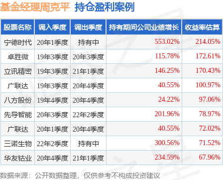 周克平管理的华夏复兴混合A基金在20年1季度买入宁德时代,已连续持有3年又1个季度。持有期间的估算收益率为214.05%,持有期间宁德时代在2020年到2022年的年报营业总收入增幅达553.02%。