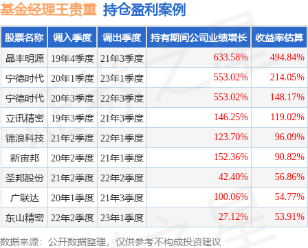 王贵重管理的嘉实科技创新混合基金在19年4季度买入晶丰明源,在持有1年又3个季度后在21年3季度卖出。持有期间的估算收益率为494.84%,持有期间晶丰明源在2019年到2021年的年报归属净利润增幅达633.58%。