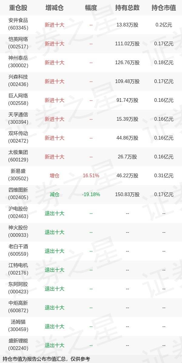 7月20日广发基金旗下罗国庆管理的广发中证1000交易型开放式指数基金公布中报。与上一季度相比,该基金前十大重仓股新增安井食品,恺英网络,神州泰岳,兴森科技,巨人网络,天孚通信,双环传动,太极集团;并对新易盛增仓6.55万股,为该基金第一大重仓股;沪电股份,神火股份,老白干酒,江特电机,东阿阿胶,中炬高新,汤姆猫,盛新锂能等退出前十大重仓股;详细数据如下: