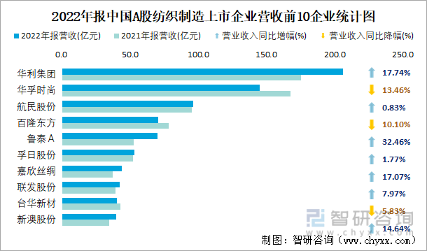 2022年报中国A股纺织制造上市公司中,华利集团营收最多,有205.69亿元,营收排名前十的企业有3家营收同比有所下滑。2022年报中国A股纺织制造营收同比增幅最高的企业为中银绒业,增速44.94%达到6.28亿元。
