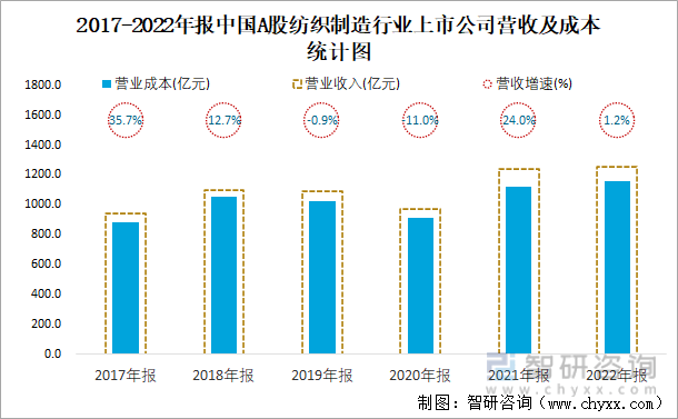 2017-2022年报中国A股纺织制造行业上市公司营收及成本统计图