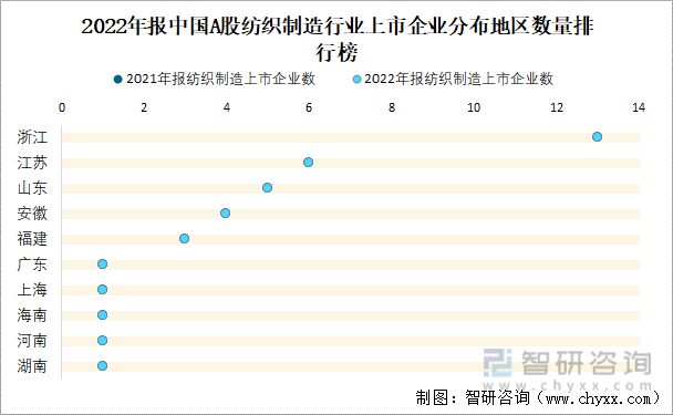 2022年报中国A股纺织制造行业上市企业分布地区数量排行榜