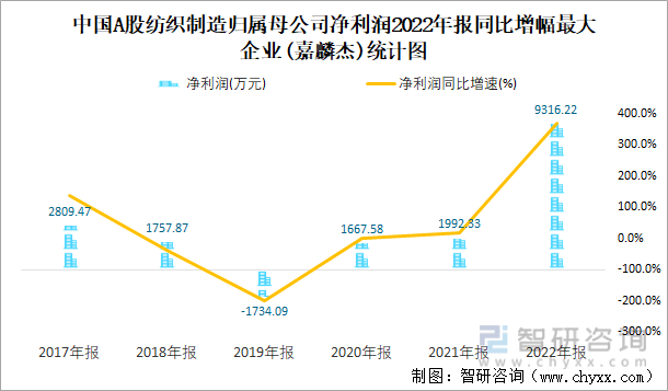 中国A股纺织制造归属母公司净利润2022年报同比增幅最大企业(嘉麟杰)统计图