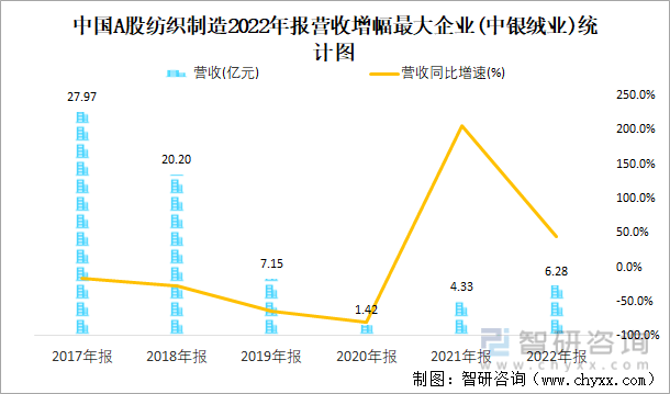 中国A股纺织制造2022年报营收增幅最大企业(中银绒业)统计图