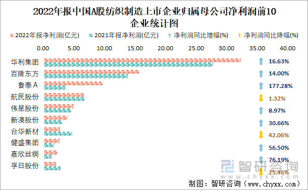 2022年报中国A股纺织制造上市企业归属母公司净利润前10企业统计图