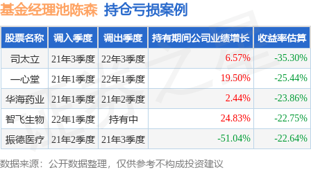 池陈森管理的安信医药健康股票A基金在21年1季度买入博腾股份,在持有3个季度后在21年4季度卖出。持有期间的估算收益率为114.24%,持有期间博腾股份在2020年到2021年的年报归属净利润增幅达61.49%。