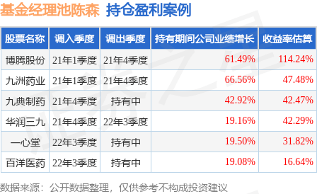 池陈森管理的安信医药健康股票A基金在21年1季度买入九洲药业,在持有3个季度后在21年4季度卖出。持有期间的估算收益率为47.48%,持有期间九洲药业在2020年到2021年的年报归属净利润增幅达66.56%。