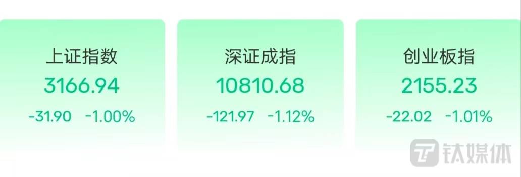 原标题:A股三大股指均跌逾1%,人工智能题材全面下挫
