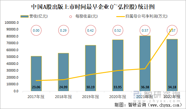 2022年报中国A股出版上市公司中,截至2023年5月31日,1993年11月18日上市的广弘控股上市时间最早距今约30年,从近几年年报营收与净利润来看,2021年报营收最高,有36.38亿元。