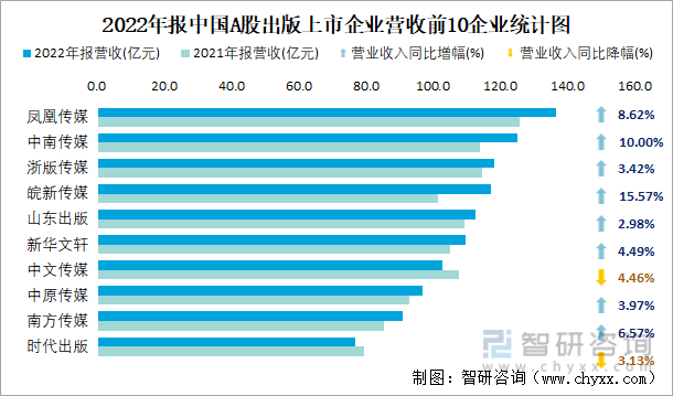 2022年报中国A股出版上市企业营收前10企业统计图