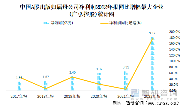 中国A股出版归属母公司净利润2022年报同比增幅最大企业(广弘控股)统计图