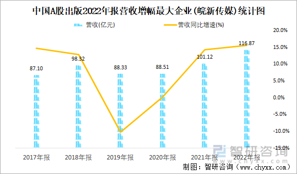 中国A股出版2022年报营收增幅最大企业(皖新传媒)统计图