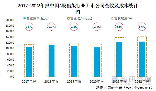 2017-2022年报中国A股出版行业上市公司营收及成本统计图