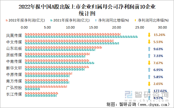 2022年报中国A股出版上市公司中,凤凰传媒归属母公司净利润最高,有20.82亿元,净利润下降15.26%,净利润排名前十的企业中4家企业同比有所下滑。2022年报中国A股出版净利润同比增幅最大企业为广弘控股,增速为177.02%。