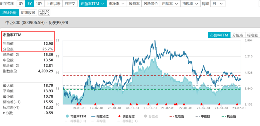 以中证800指数估值为例,截至7月19日,800ETF(515800)标的指数(中证800指数)市盈率12.98倍,位于近5年以来25.7%分位点,意味着低于近5年74.3%的时间区间,具备较高估值性价比。