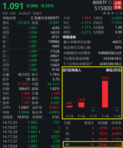 尽管近期行情震荡,但资金却持续重手布局A股大中盘板块。以800ETF(515800)为例,上交所数据显示,800ETF(515800)近5日、10日、20日、60日均获资金增仓,近60日净流入总额高达2.30亿元,资金净流入率达11.36%!
