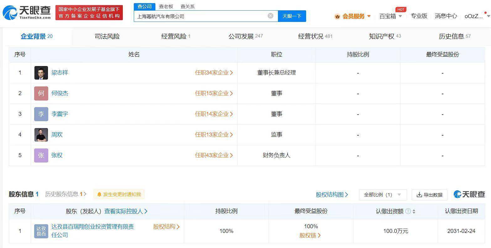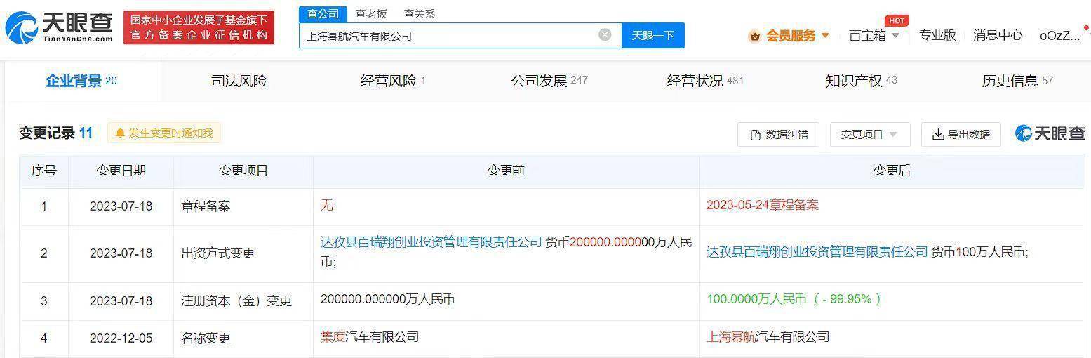 【大河财立方消息】天眼查App显示,近日,上海幂航汽车有限公司发生工商变更,注册资本由20亿人民币减至100万人民币,降幅99.95%。该公司成立于2021年3月,法定代表人、董事长兼总经理为梁志祥,经营范围含新能源汽车整车销售、汽车零部件及配件制造、新能源汽车换电设施销售、软件开发、汽车租赁等,由百度旗下达孜县百瑞翔创业投资管理有限责任公司全资持股。
