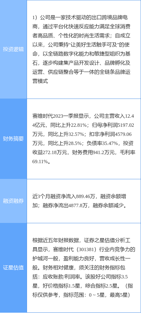 赛维时代涨停收盘,收盘价41.77元。该股于9点32分涨停,未打开涨停,截止收盘封单资金为1.41亿元,占其流通市值10.74%。