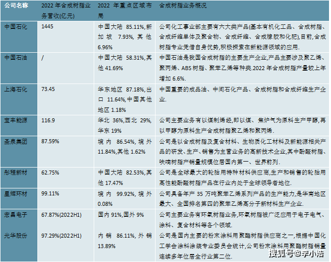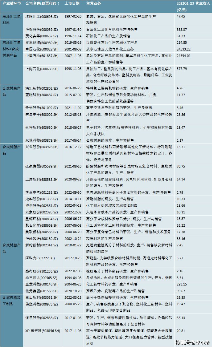 图表:中国合成树脂行业上市公司基本信息及经营情况