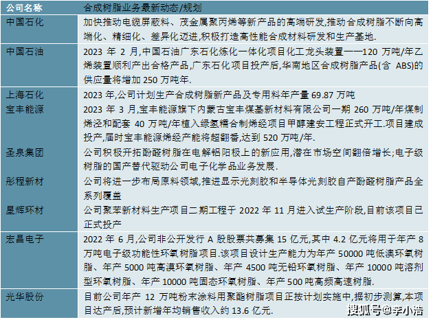 图表:中国合成树脂行业上市公司最新业务动态/规划